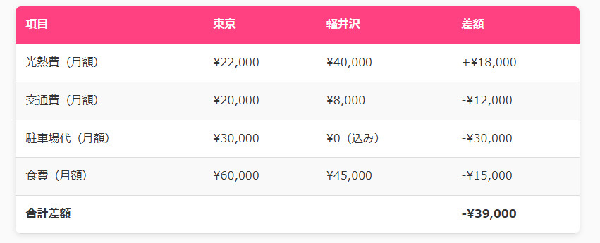 光熱費だけを見ると確かに軽井沢の方が高くなりますが、生活全体のコストで比較すると意外な結果が見えてきます。まず、軽井沢では車での移動が中心となるため、都心での電車代がかからなくなるんです。