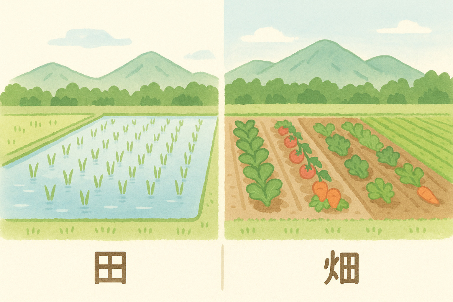 一般的には「耕作の目的に供されている土地」を「農地」と呼びます。これは農地法第2条第1項で定められています。不動産登記事務取扱手続準則68条では、地目として「田」と「畑」が定義されており、田は農耕地で用水を利用して耕作する土地、畑は農耕地で用水を利用しないで耕作する土地とされています。