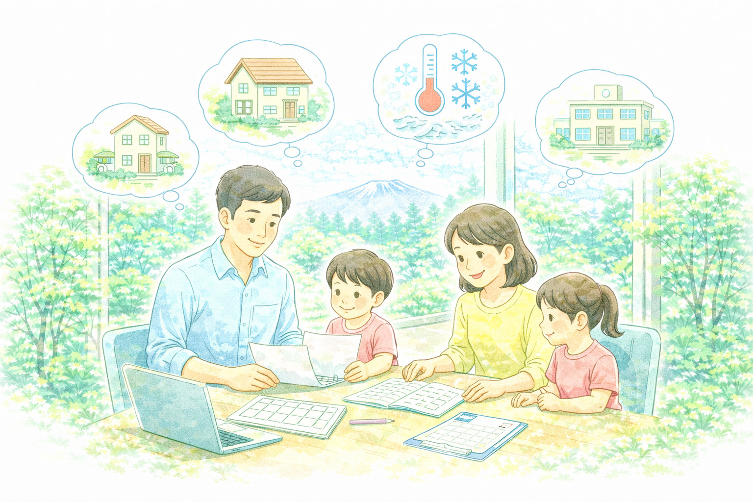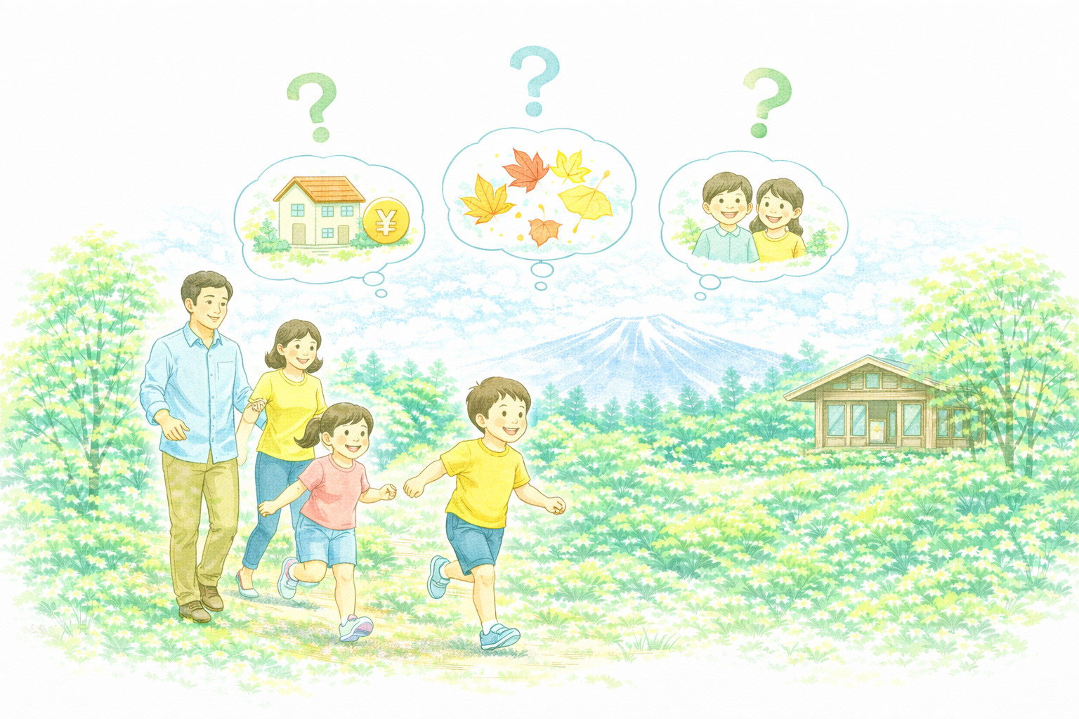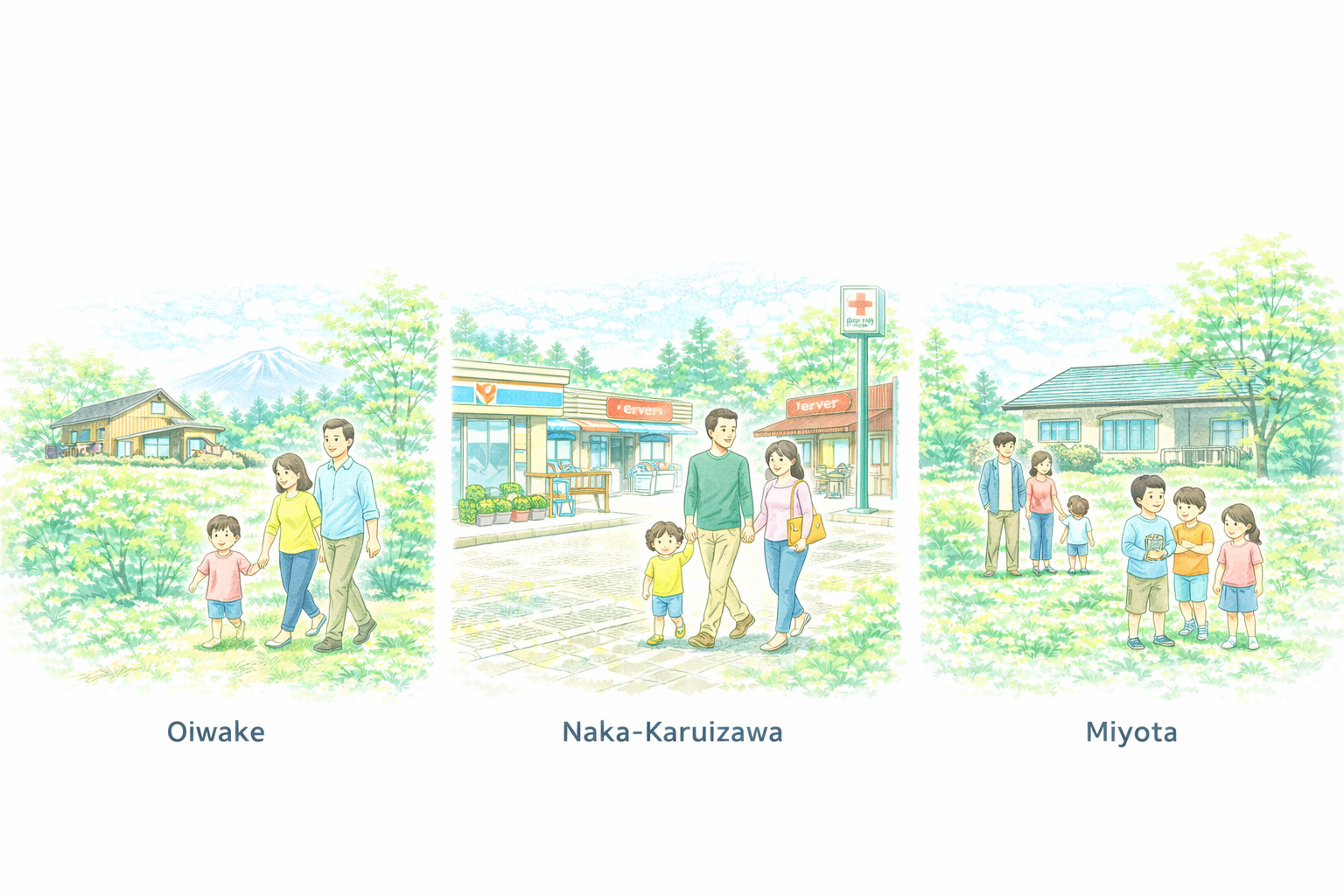 エリア選びは、「通う学校・保育園」「職場(リモートワークの頻度)」「予算」のバランスで決めましょう。風越学園を目指すなら追分・発地エリア、利便性重視なら中軽井沢、予算重視なら御代田という選択になることが多いです。