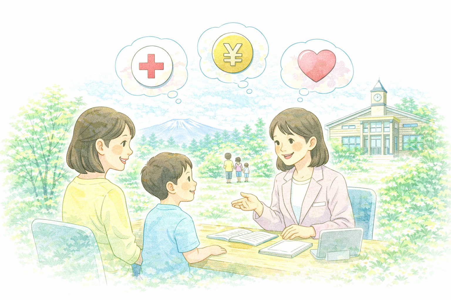 ・ 子ども医療費助成:18歳年度末まで助成(受診ごとに500円等の自己負担あり。詳細は町の制度説明を参照)