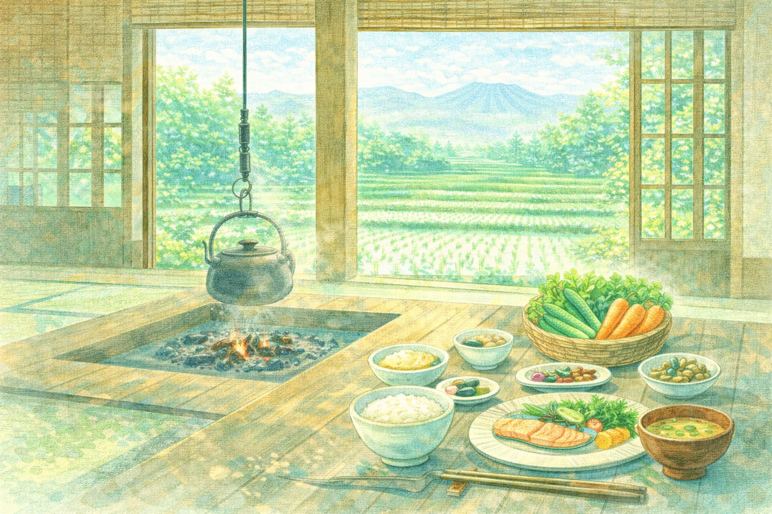 薪をくべてかまどでお米を炊き上げる本格派。信州味噌仕立てのとろろに焼き鮭、湯豆腐など、ご飯に合うおかずが盛りだくさんの朝食は絶品です。目の前に田んぼが広がる牧歌的な風景も魅力です。