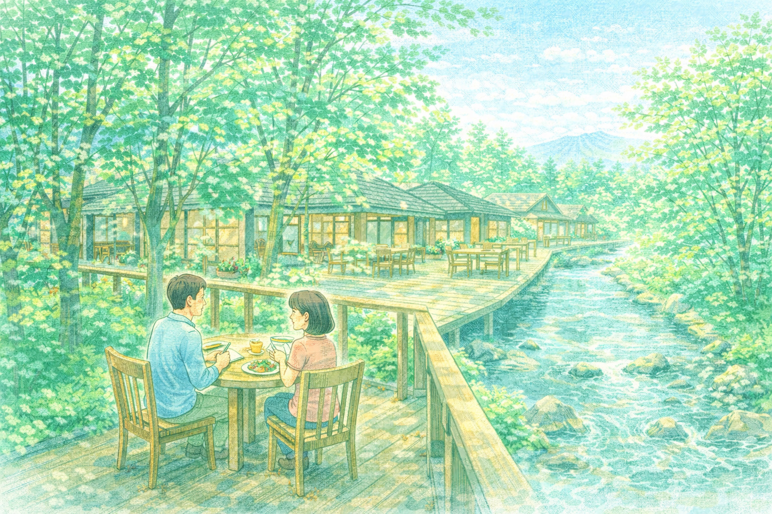 ハルニレテラスは朝7時から営業している店舗があるので、早朝の散歩と組み合わせるのがおすすめ。川沿いのウッドデッキで、せせらぎを聞きながらの朝食は最高の贅沢です。