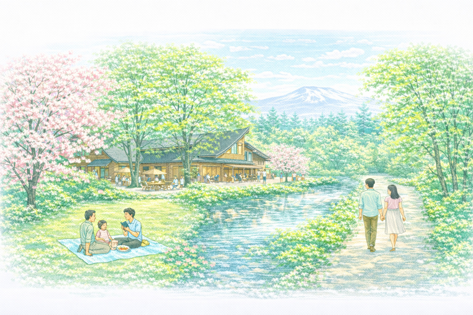 ハルニレテラスから車で約10分、矢ヶ崎公園へ。広々とした芝生広場でのんびり過ごしたり、桜の木の下でピクニックを楽しんだりできます。
