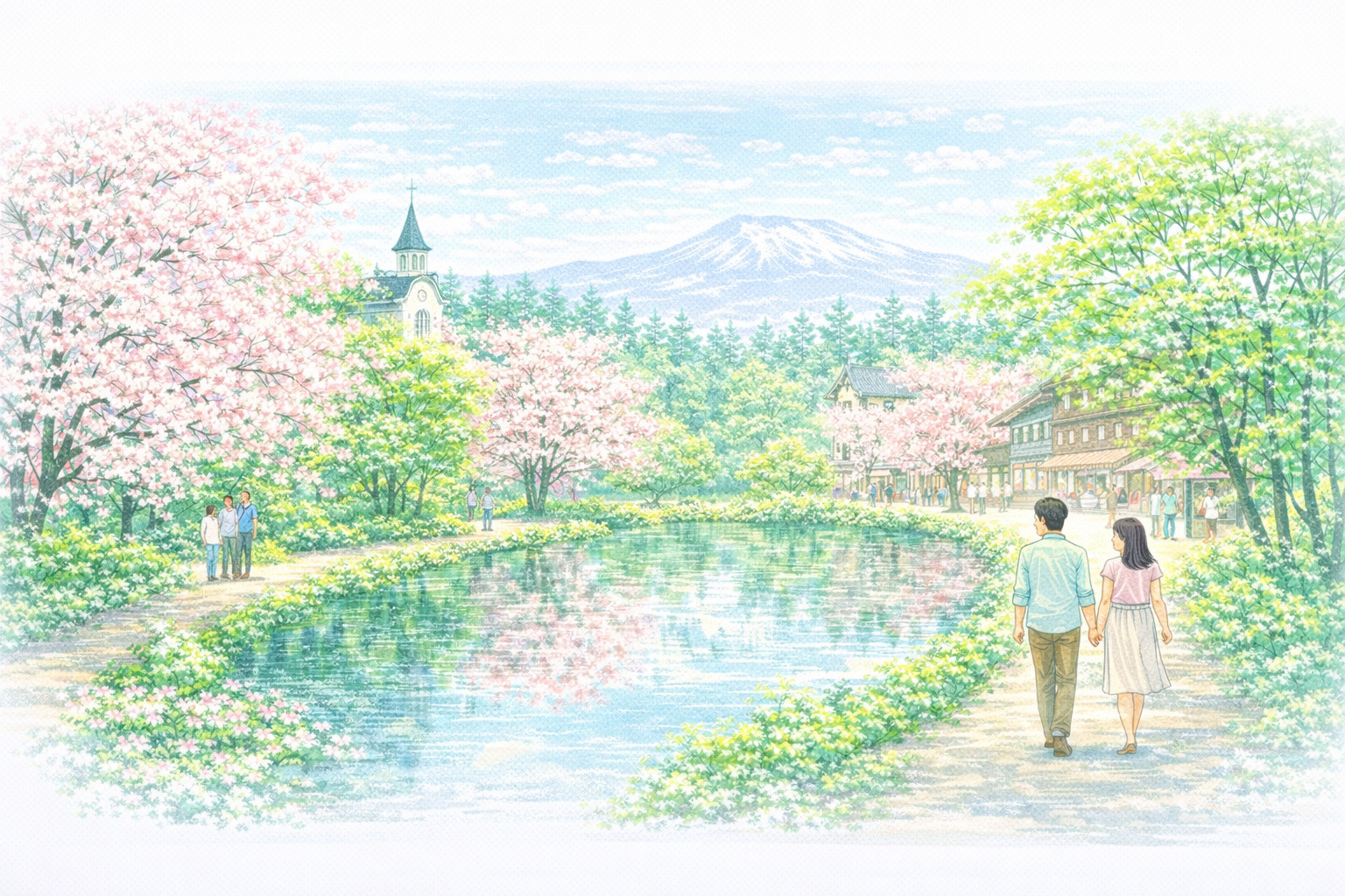 まだ人が少ない早朝の雲場池を訪れ、静かな池面に映る桜と新緑を鑑賞しましょう。一周約20〜30分の散策路をゆっくり歩きながら、写真撮影も楽しめます。